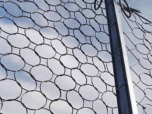 常用規(guī)格:[鋼柱(間距10M),帶消能環(huán)的∮16雙支撐繩和∮16“人”字形上拉錨繩(每跨6個消能環(huán)),∮16側(cè)拉錨繩(單繩),◇/08/200/4*5㎡鋼絲繩網(wǎng),∮8縫合繩,格柵網(wǎng)]